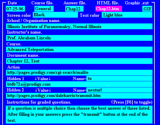 Want to avoid gateway scripts? Coming soon (I hope), this program will score and combine quizzes received as E-mail. The basic premise is that you must store all your quiz e-mail in the directory C:\TESTER\GRADING along with the corresponding correct answer file (which will automatically be placed there by the program when it makes the HTML quiz). Start the program and you get graded quiz scores. It will work as a gateway script (as far as grading the quizzes) for e-mail. As long as you load all quiz e-mail into the directory it will score multiple quizzes for multiple courses for multiple instructors.
