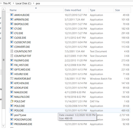 IMPORTANT!!! Some unzipping software will create a sub-folder to C:\POS named C:\POS\POS71J and then unzip the program files to there. In other words when you do manage to find the files, like in the graphic above, the address line at the top will read > This PC > Local Disk (C:) > pos > pos71j. THIS IS NOT GOOD! If this happens to you then copy the contents of C:\POS\POS71J to C:\POS and then you can delete the folder C:\POS\POS71J and its contents.